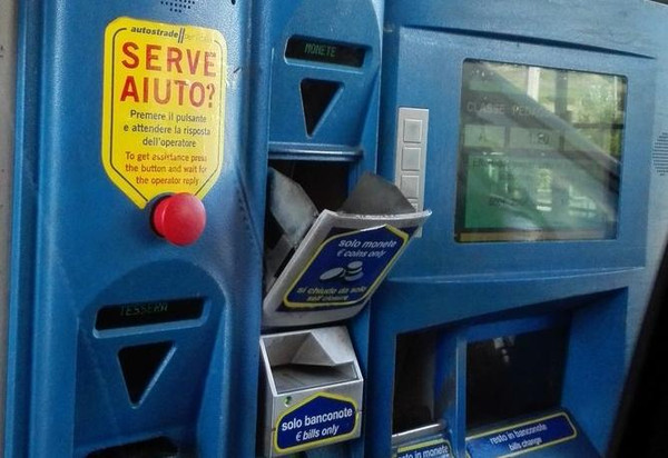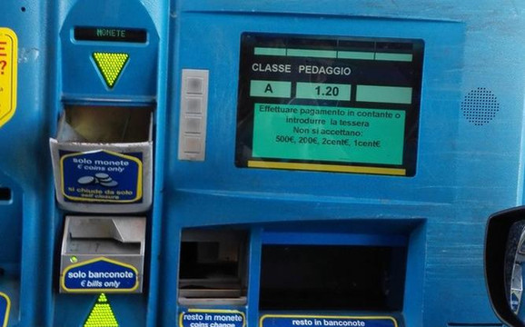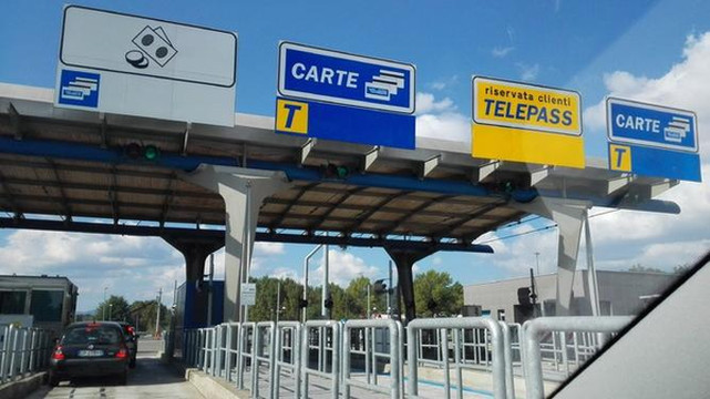 如上图,意大利的高速公路(Autostrada)入口有分Telepass 和非Telepass的。Telepass估计是类似于中国高速入口的那个ETC,也就是感应自动付费系统。但入口处,不管是不是Telepass,一般都有计费票子可以拿。
