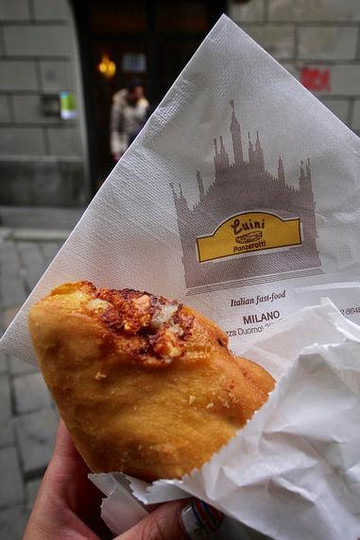 意大利有三宝,面饼,奶酪,番茄酱。这三种东西在一起演变出各种个样希奇古怪的东西。而且,烹饪手段还都是烤。在面对Duomo大教堂左手边的小巷子里有一家做Panzerotti的,店名叫Luini,Panzerotti外皮松软又带点嚼劲,和番茄起司融合在一起非常美味。