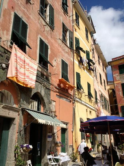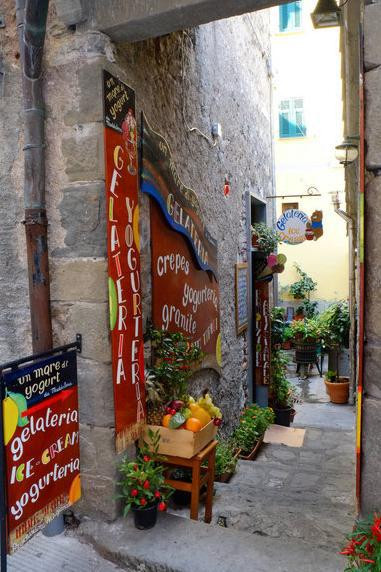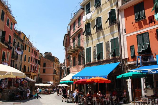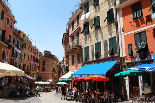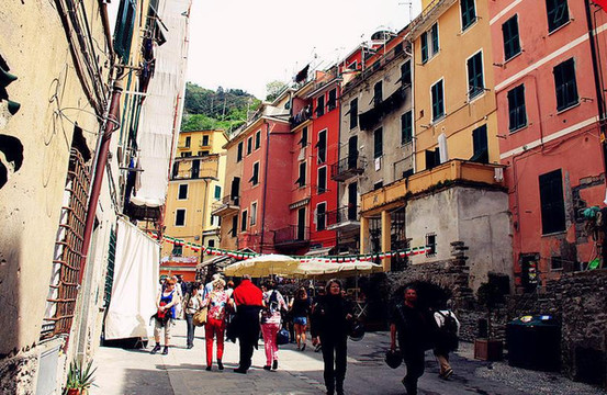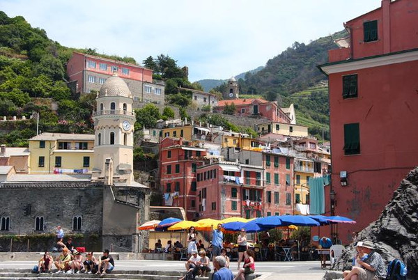 高低错落颜色斑斓的房子沿着山势而建,拥挤而从满了层次感。小村落游客很多,全部拥挤在短短的主街上,街道两旁都是吃吃喝喝的店。这个村子家家都做生意吧,不像Corniglia,还有点僻静感。