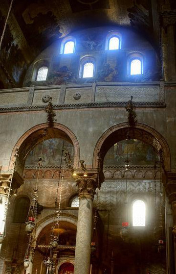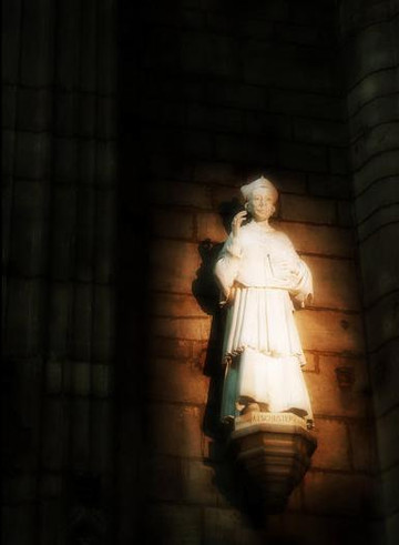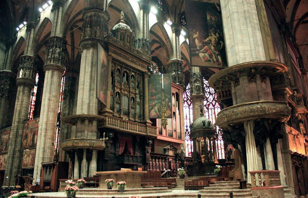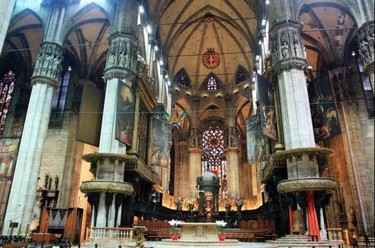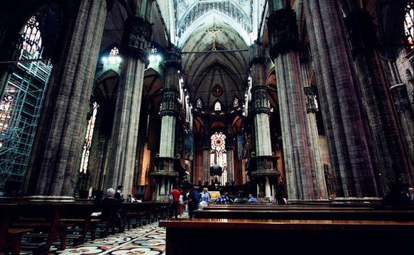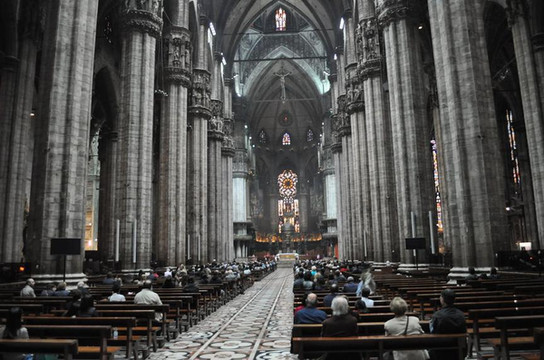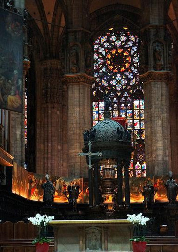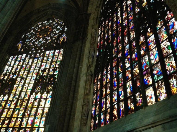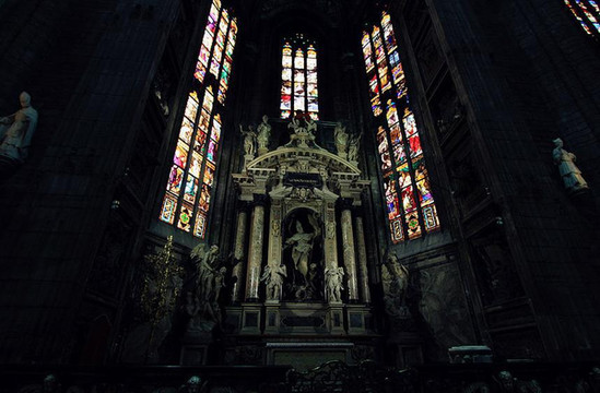 走进教堂,巨大的穹顶令人叹为观止,哥特式建筑特有的形式引导人的目光直接超越尘世,进入神的天穹。彩色玻璃长窗从底到顶,光线映射进来,整个教堂内部象笼罩着一层迷离的烟雾。