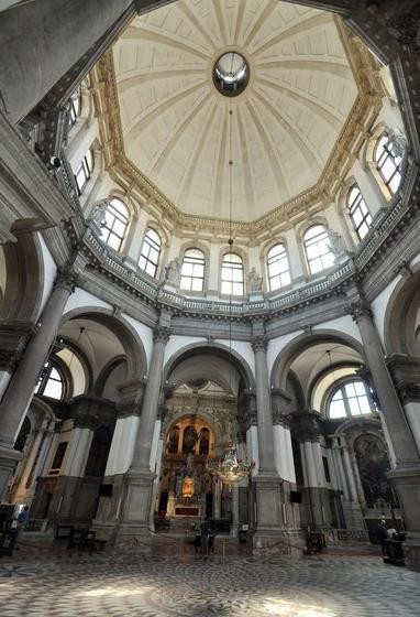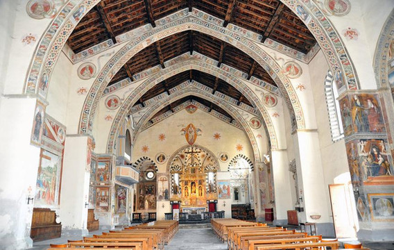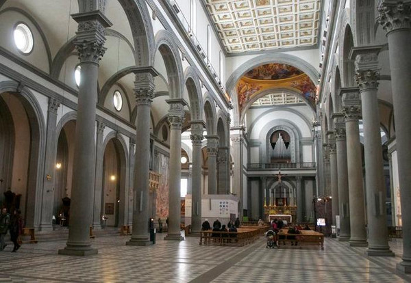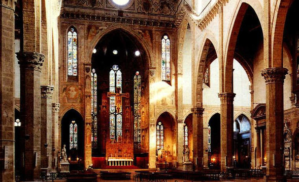 从入口到三大殿尽头,整个地板用旧墓石铺就,教堂的窗玻璃彩画都是14世纪末期作品。教堂的圆顶帕奇礼拜堂(Appella de’Pazzi)由布鲁内雷斯基所设计。礼拜堂里有阿鸟洛·加迪的壁画《圣十字架传说》,祭坛上有杰里尼作的画作《圣母和圣徒》。