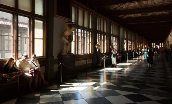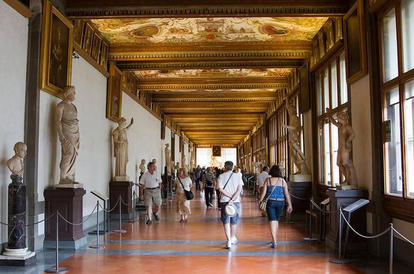 乌菲齐美术馆是意大利最重要的美术馆之一,也是欧洲最重要的美术馆。全世界著名的画作全都在这个美术馆里,参观顺序建议:拜占庭风格(金色底色,人物瘦削细长,表情死板)→锡耶纳风格(金色底色, 圣母等显得比较像人的体型, DUOMO 正门上的画)→翁布里亚画派(风格以静雅优美取胜)→ 威尼斯风格(比较人性化)→ 佛罗伦萨文艺复兴(彻底摆脱宗教的影响, 人性化的圣母等, 颜色细腻艳丽,讲究透视画法)。