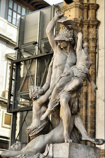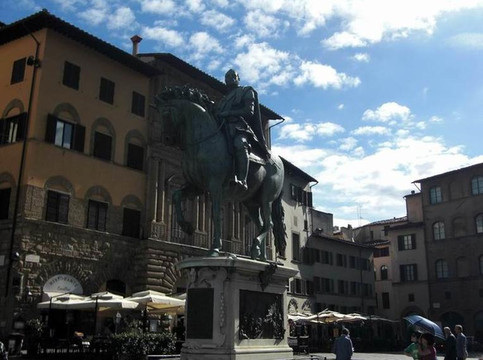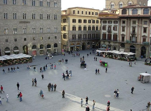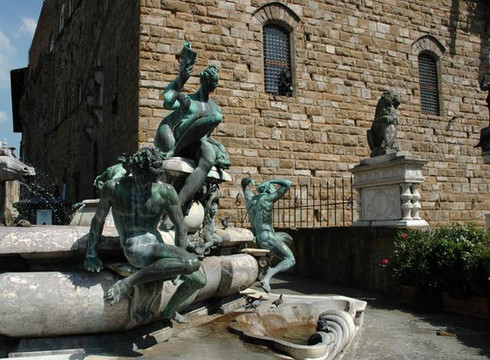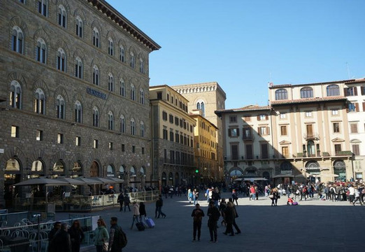 在雕像《大卫》的侧面,是有更多雕像的兰齐凉亭,里面的雕塑都有好几百年历史。从市政广场往韦基奥宫上面看,可以看见将近百米高的阿诺福塔,这座钟楼似的建筑和圣母百花大教堂一样是佛罗伦萨的标志性建筑。在市政广场上还有好多雕像,有时间话可以慢慢欣赏,这绝对是一个露天的雕塑博物馆。
