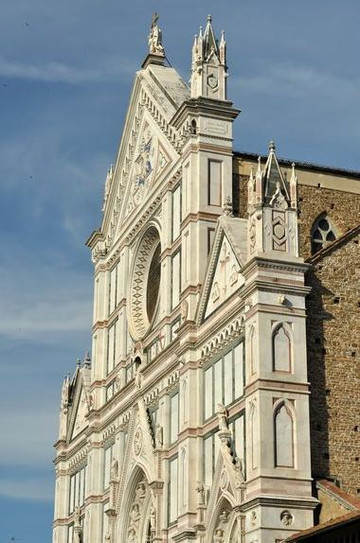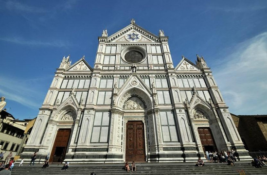这座哥特式教堂的特点在于其不同色彩的大理石装饰的正面,有着大气庄重的氛围,内有很多艺术作品,并埋葬着诸如米开朗琪罗、维托利奥· 阿利、尼科洛·马基亚维利、焦阿基诺·罗西尼和乌戈·福斯克洛等名人,还藏有乔托的画,有巴尔迪小礼拜堂内的壁画等。但教堂真正不争的最伟大杰作还是帕齐小礼拜堂,这是布鲁内莱斯基的作品,是文艺复兴建筑的典范之作。