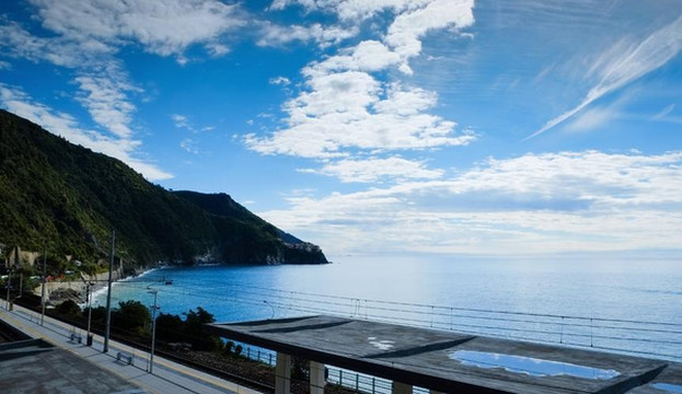 昨晚夜宿的马纳罗拉在整个五渔村的中部,再往北走按顺序就是科尔尼利亚——韦尔纳扎——蒙特罗索,早晨从马纳罗拉出来,在海边乘小火车前往科尔尼利亚,一早起来明媚无暇的天气给行程一个美好的开始。