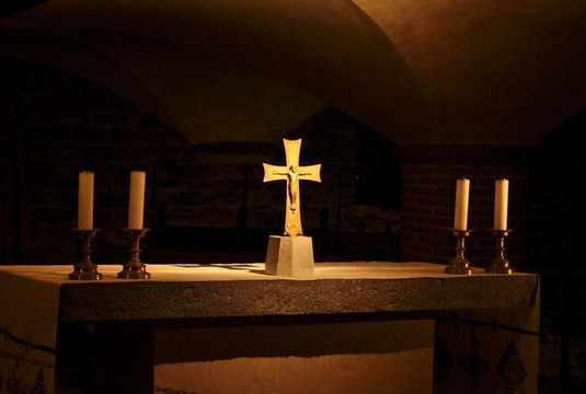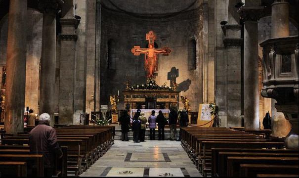 管风琴的演奏雄浑庄严,唱诗班只有四人,歌声却神圣飘渺如临云霄,神父的祈祷低沉慈爱如诵诗。抬起头,最高处耶稣被痛苦地绑缚在十字架上,用悲悯的目光俯视着苍生。