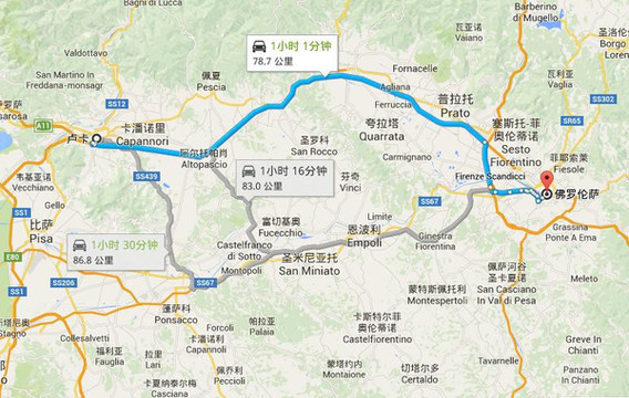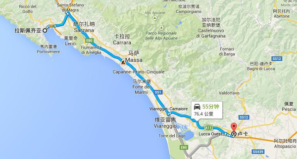 卢卡在佛罗伦萨的正西边,开车从城东出去,上A11高速,然后转E76国道。高速部分收费4.6欧。