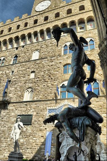 佛罗伦萨市政广场不大但是广场上确有众多雕塑精品,在众多雕塑中最有名的当属米开朗基罗的大卫了,不过这里的大卫是复制品,真迹现藏于学院美术馆里。
