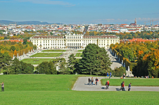 返身走下山坡,再看美泉宫,依然是那么的美。向远处看,整个维也纳沐浴在金色的阳光下,一大片红瓦白墙建筑中露出斯特凡大教堂尖尖的一角,显得如此地美轮美奂,在蓝天和绿茵烘托下如同一幅美丽的维也纳风情画。