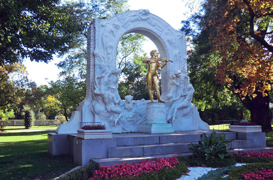 公园里的雕像非常之多,不经意间就能碰上一个,其中有我们所熟悉的贝多芬、弗兰茨.舒伯特、布鲁克纳、罗伯特.施多尔茨等人的雕像。不过最出名最耀眼的就是那座位于大门入口不远处的约翰.施特劳斯镀金雕像。这位伟大的音乐家把原本那种只属于民间的舞曲形式提升为宫廷中的一项高雅的圆舞曲,他所创作三节拍的圆舞曲华尔兹更是闻名于世,被人们誉为“圆舞曲之王”。在这座涂金雕像上,施特劳斯大师手拉小提琴,正在为观众演奏他的音乐。背面的汉白玉拱门上有各种石刻的人物造型,极好地烘托出主人公的整体形象。