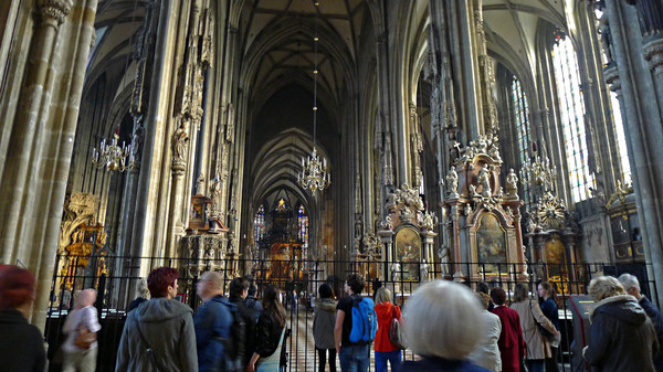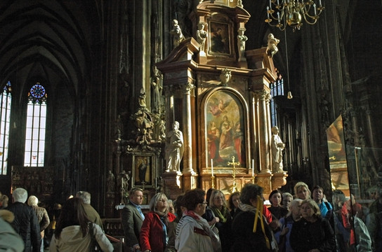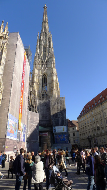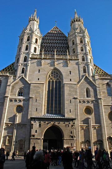 出了公园大门一直往前走,经过几个十字路口,就能看到世界上最著名的斯特凡大教堂(Stephan dom)。教堂前的广场上游人聚集,几处可供人们休息的长凳都坐满了人。大教堂由一座主体楼和三座楼塔组成,用彩色琉璃铺就的屋顶,被称为“维也纳的精魂”,在欧洲的教堂中极其少见。大教堂是维也纳市的标志,同样被评为世界文化遗产。