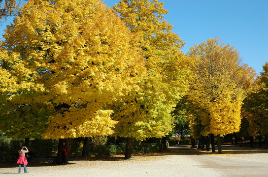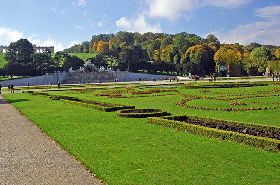 步入花园,在碎石子铺成平面上,是一片片造型美观、布局巧妙的花坛和草坪,两侧对称的花坛沿着宫殿向南这条中轴线,构造出直线、弧线、半圆等优美、整齐的图案。在花坛两边则是高大的菩提树,被剪成一面整齐的树墙以及姿态各异的许多雕像。大片的绿地和丛林给宫殿平添了一分妖娆,也彰显出昔日皇室的华贵与大气。