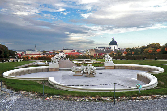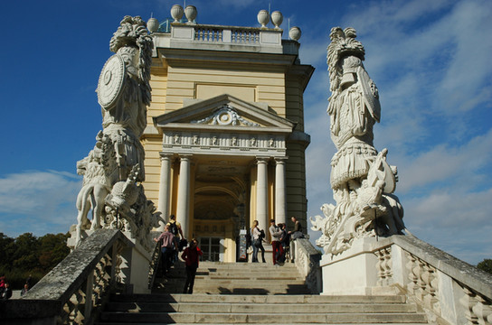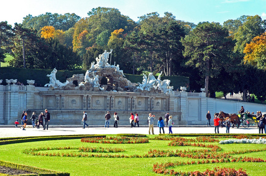 我们信步走到园内巨大的海神喷泉池。那是一座建于1780年的喷泉,喷泉前部是宽广的水池,与美泉宫宫殿的南向露台遥遥相望。水池的中央是一组根据希腊海神尼普顿(Neptune)的故事塑造的雕从这里沿着之字形小路走上丘陵,就来到了美泉宫的最高点—凯旋门观景台。这座凯旋门是为了纪念奥地利于1757年战胜普鲁士的军队而建的,如今已经改成咖啡馆和餐厅,喝咖啡的人还不少呢。在凯旋门楼下左侧回廊旁有楼梯可以登顶,门票为每人2.5欧元。不过没有多大意义,可以省下这个钱。