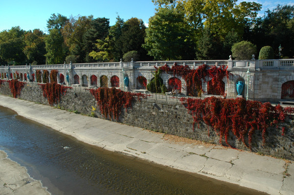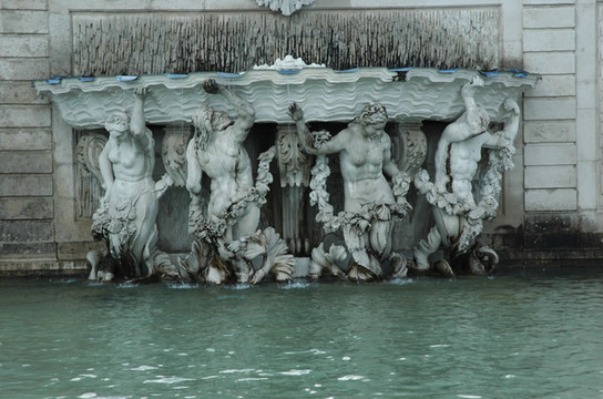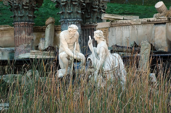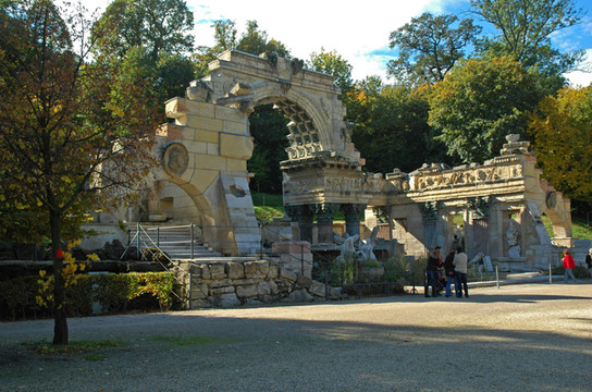 回到海神喷泉,我们选择朝东走,从那里可以到达赫赫有名但是不很起眼的“美泉”,整个夏宫的名称也由此而来。从一条绿树如盖的甬道前行不远,先看到一座“罗马废墟”,那并不是真正的废墟,乃是当年模仿古罗马废墟而专门设计的景观。整个建筑主体是一座长方形的水池,水池背后是立柱支撑的半圆形拱门,左右两侧则是宏伟壮观的围墙。拱门与围墙都是典型的古罗马建筑风格。