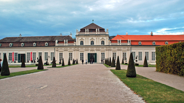 美景宫宫殿的主人名叫欧根(EUGEN)亲王,在18世纪初,为表彰欧根亲王为哈布斯堡王朝抵御土耳其入侵所立下的不朽功勋,皇帝分封给他许多土地,欧根便在其中一块土地上建造起他的私邸。他根据自下而上的地形特征,因地制宜地采用对称设计的梯阶和园艺布置建造花园,在轴向设置喷泉水池。花园的两端一上一下设计了两座宫殿。处于高处的上美景宫规模宏大,其华盖般的铜圆顶模仿了土耳其的帐篷造型,显得十分有气派。如今这里是奥地利国立美术馆,陈列着十九世纪和二十世纪的绘画。处于低处的下美景宫则供欧根亲王自己起居之用。如今这里是奥地利巴洛克艺术馆。