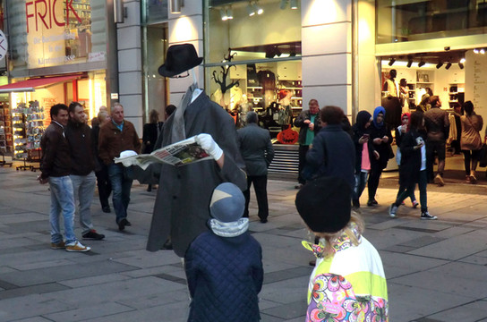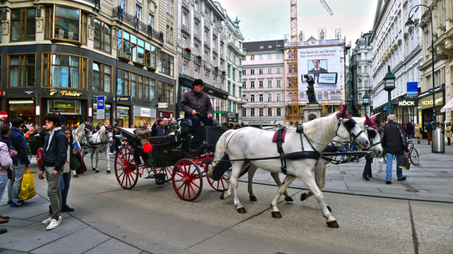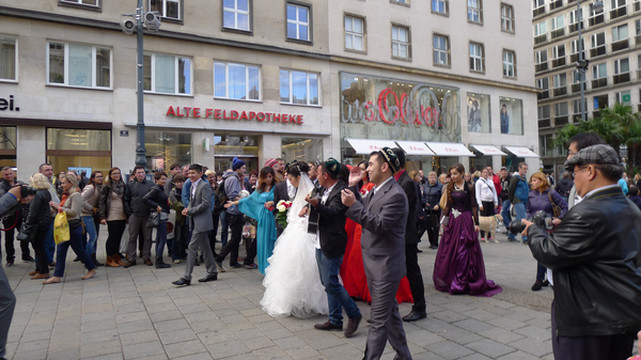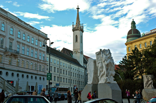 从斯特凡大教堂向南沿着凯隆特纳大街(Kärntner Strasse)步行,街上行人很多,还遇上一对新人举行婚礼,有趣的是他们不像我们这里坐婚车去饭店,而是步行去教堂,让城市里所有的人为他们祝福。