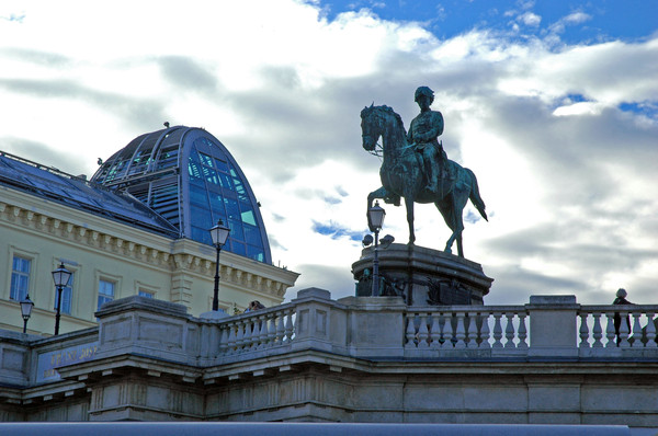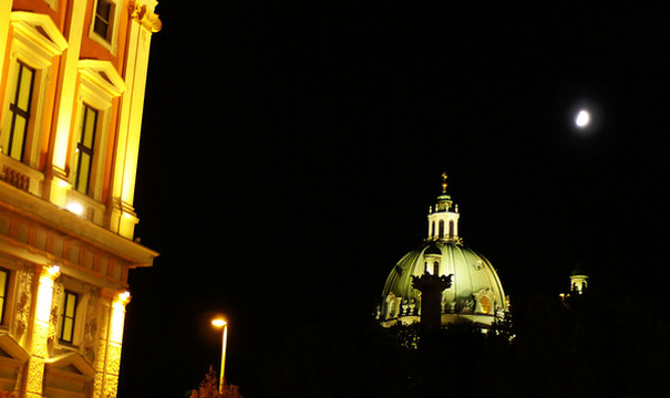 出了金色大厅,夜已深了,一钩明月高挂在深蓝色的天空,金色大厅在霓虹灯的反射下呈现出金黄色的光芒,马路斜对面,维也纳博物馆华美的穹顶如同一个金色的皇冠,在夜空中显出灼亮的容貌。夜色下的维也纳,依然给你展示着一种特有的魅力……