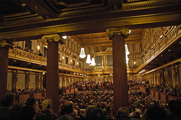 出了花园,我们仍坐71路返回到市政厅和玛利亚广场,简单用过晚餐后前往维也纳金色大厅去欣赏一场莫扎特音乐会。音乐会的门票早就提前在官网上订好,很方便。(音乐之友协会官网:http://www.musikverein.at)由于我们对欣赏西方古典音乐完全是个门外汉,只是为了领略一下金色大厅风采,感受一下音乐厅里优美动听的音响效果而已,因此,每个人仅仅花了6欧元买了张站票。