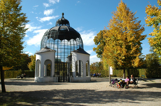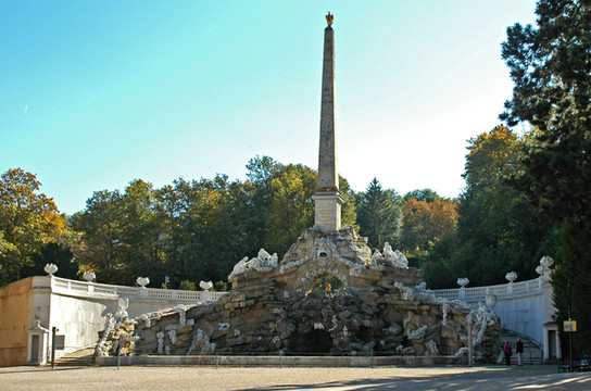 从罗马废墟(Roemische Ruine)甬道继续向东,还会看到一块埃及的方尖碑,在碑的下方,是一个小山洞,泉水从洞口飞溅而出,经两三级水池后落入前面的大池中,看上去十分壮观。