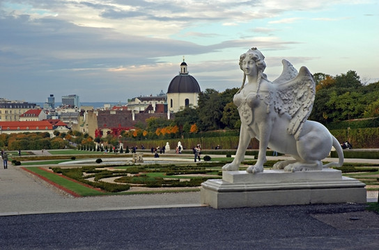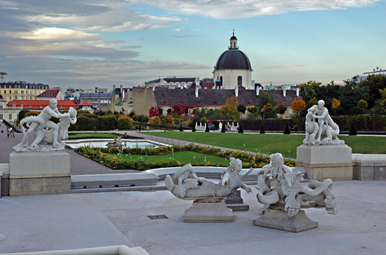 漫步走到上美景宫,我们驻足小憩片刻。放眼望去,周围是一幅祥和、恬静、优雅的画面,处处给人以美的享受。正是夕阳时分,在落日余晖的照耀下,园内所有的建筑、雕塑和簇拥的林木都披上了浓浓的中世纪色彩,凝重而又久远。如今,随着时光的流逝,眼前留下的只是历史的沉淀和往事的见证,日复一日地在那里无声地述说着昨日王室的辉煌和兴衰。