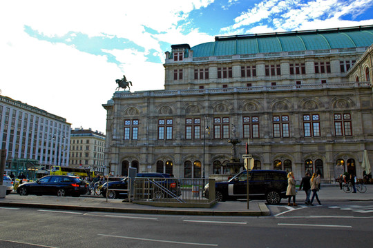走了约1公里路,就到了素有“世界歌剧中心”之称的维也纳国家歌剧院。歌剧院建于公元1869年,其建筑特色完全按照文艺复兴时代的式样,全部用白色大理石修建。正面是五个拱形大门,有五座青铜雕像。从建成这一天开始,它就是世界公认的音乐圣殿。许多著名的作曲家、演奏团队和剧团都以能够在国家歌剧院演出而感到荣幸。