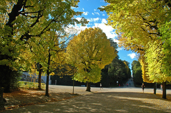 花园的尽头是豪华的海神喷水池以及蜿蜒向上的山丘小路,山丘的顶端是一座巨大的巴洛克式建筑“凯旋门”,游人置身于此,无不令人赏心悦目, 心旷神怡。