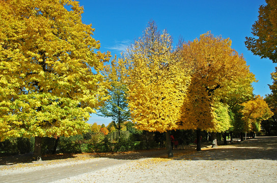 这是一段走在梦幻世界里的路。正是秋叶簌簌的季节,层林浸染,秋韵正浓,林间散发出淡淡的馨香,金黄色的树叶与蓝天相衬,显得格外靓丽耀眼;缕缕阳光撒在树丛上,透过通透如玉的叶片给地面涂上了迷幻般的斑斓,散落的秋叶铺就了一层金黄色与火红色的秋垫。深秋的画笔,勾勒出一幅真实版中的古典油画。忽然间,我想起俄罗斯著名画家希施金笔下的那幅油画—《造船用材林》,年轻的时候,我曾经多次临摹过这张画像,作为馈赠给亲朋好友的礼物。那时的我,曾经多么憧憬和向往画中的那种意境,几十年后竟然成了现实!