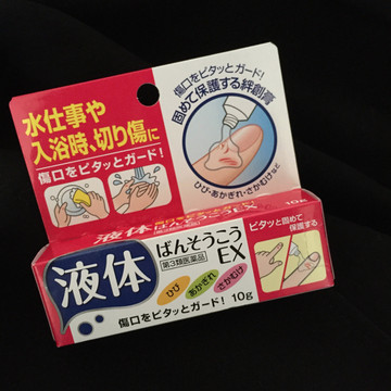 这个神物我第一次知道是去年夏天在巴黎的时候,收雨伞不小心把手割着了,在一家台湾牛肉面店里吃饭时,一个台湾姑娘店员好心的把液体创口贴拿出来给我涂。然后我才知道竟然还有这么方便的创口贴!!!不用担心被水打湿,涂上的感觉有点类似502胶水粘在手指上,有形成一层薄薄的透明胶状体,一般药妆店里都能买到。