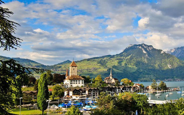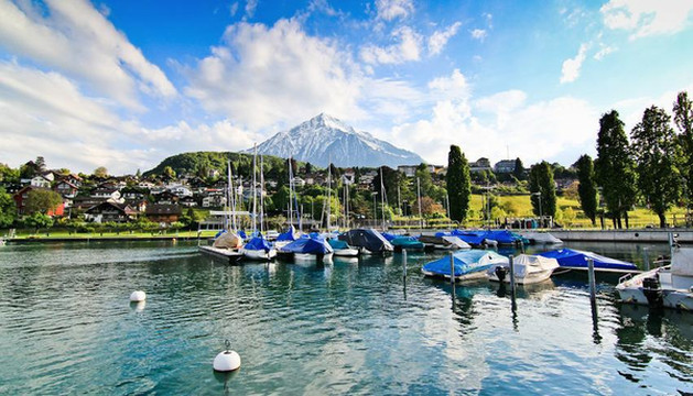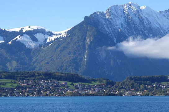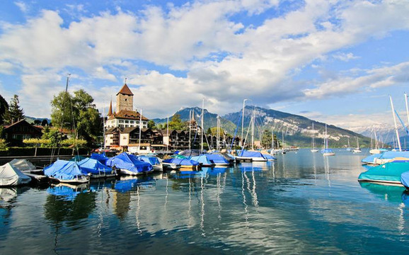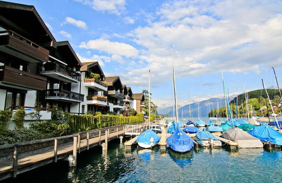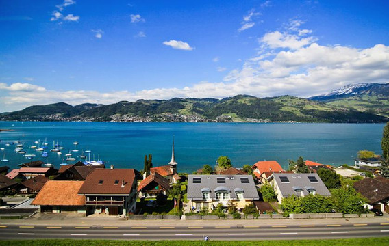 最好的观湖小镇是施皮茨,非常富裕的小镇子,整排的船帆构成了靓丽的风景线,点缀着最美的蒂凡尼蓝的湖水,对面可以看到图恩镇依山而建的木房,典型的瑞士风光。