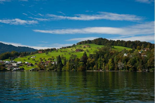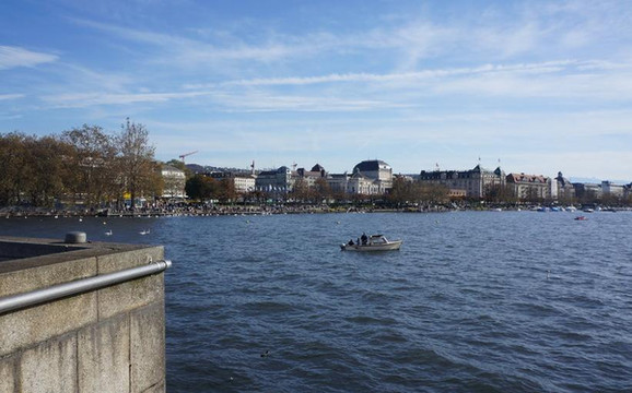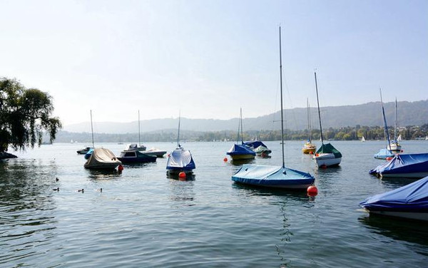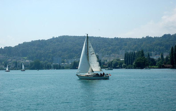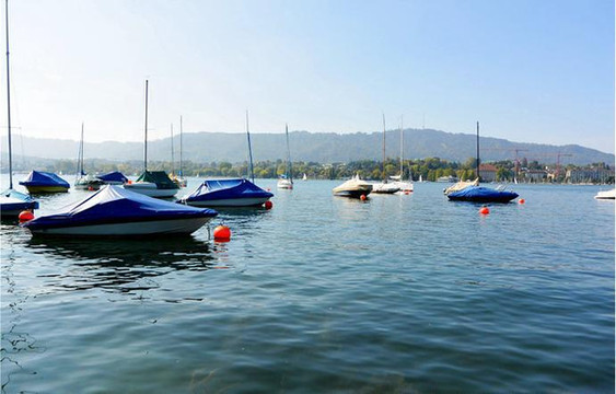 苏黎世湖湖犹如一弯新月倚在市区的东南端,长达40多千米,蔚蓝色的天空映着碧绿的湖水,片片白帆摇曳着湖上的云彩,郊区的山谷绿草如茵,林木葱茏。