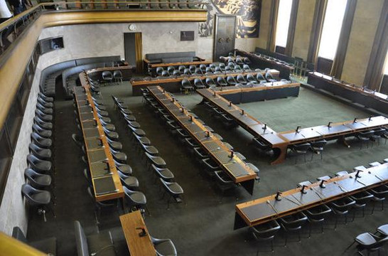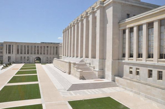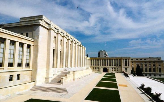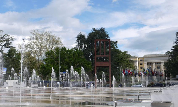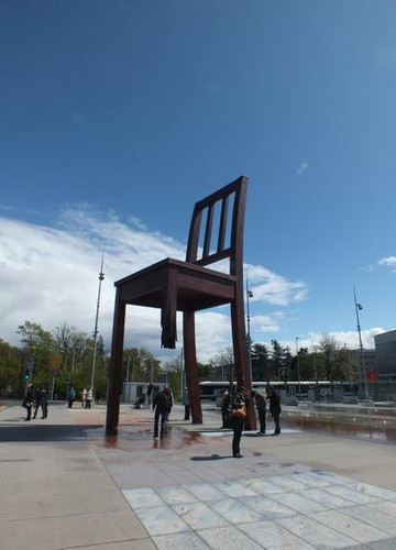 抱着很大的好奇心想去看看联合国是个什么样,排队老长,交了护照,检查也特别严格。这个国际性组织的办公大楼的外观都显得非常的低调,要是没人介绍和没有一些特有的旗子,也许你会认为这就是一幢再平常不过的住宅楼而已,在联合国欧洲总部的院子里插了无数的国旗。在大门正对的地方摆着一个三条腿的椅子,这是瑞士著名雕塑家丹尼尔?伯塞特1997年代表国际残联为纪念《地雷议定书》的正式生效而创作的,地雷原本用于军事,但全球每年都有数万无辜平民包括儿童触雷伤残。设计的大椅子是三条腿的,象征人类因触雷而残缺的肢体,仍然顽强地、有尊严地站立着。在凳子后面是喷泉。有很多的小孩在玩耍,这更像一幅画面:纵使战争的苦难也掩盖不住孩童心中那种率真童趣的心性。