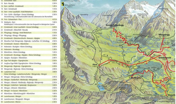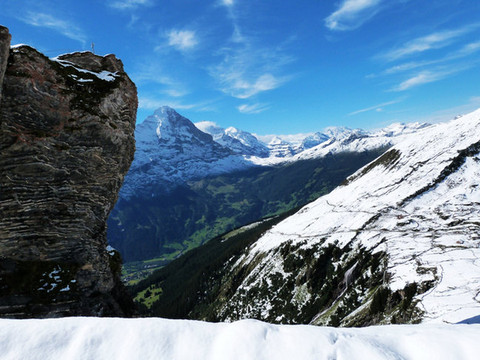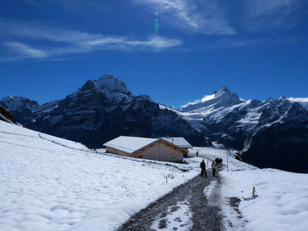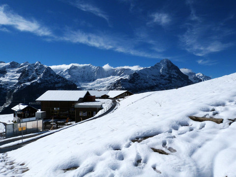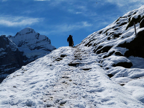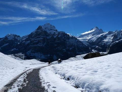 1、中线:Maennlichen -- ,双向的徒步线路,单程约100分钟,瑞士观光局和一般旅游书都大力推荐的路线,路途比较平缓,KleineScheidegg比Maennlichen海拔略低。从Maennlichen向Kleine Scheidegg徒步,是向着南边,面对少女峰等群山。