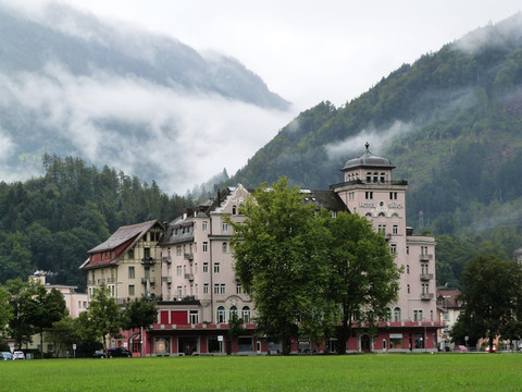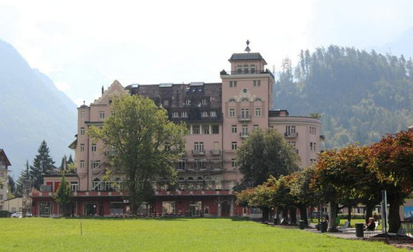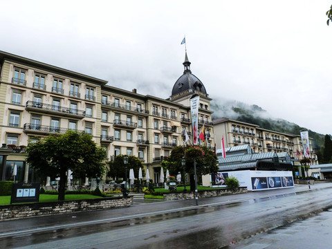 主街上有一座雄伟壮观的欧式建筑,雕刻精美的罗马柱,蜜黄色的粗粝外墙,雕花灵动的黑色铁栏杆阳台,还有窗沿边一面面随风飘扬的旗帜。这座气势磅礴的大楼在午后阳光的照耀中格外吸引游人眼球。根据临行前做的功课,很快判断出这就是小镇上最著名的酒店,因特拉肯旅馆。