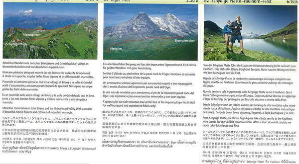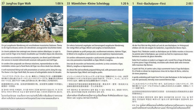 少女峰徒步是很多很多人趋之若鹜的。确实,徒步少女峰,既有雪山,又有草甸,还有鲜花,何等美景。瑞士的徒步设施也非常齐全,专用的徒步道,道上有地图和指示牌,指示牌可以现实去目的地需要耗费的时间。记得在information拿一本小册子,上面介绍每一条徒步线路,有线路的特色、路线和所需时间。