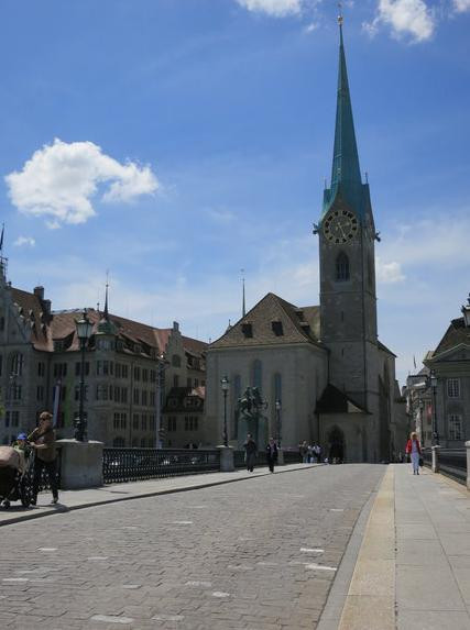 有着蓝绿色尖顶的,就是苏黎世圣母大教堂,来到利马特河上的Münsterbrücke桥边,桥的西侧是圣母大教堂。远远望去,教堂塔楼淡蓝色的尖顶在蓝天的映衬下高耸入云。走在苏黎世城里,一定可以看得到这座教堂。它很美,留在许多游人的照片里,也留在它的信仰者的心里。
