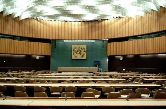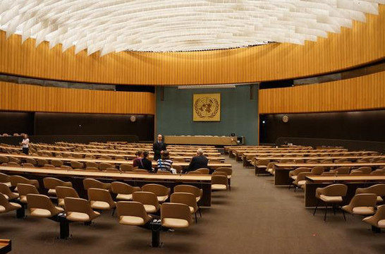 里面各个会议室之间的走道走廊上摆放着各个国家送给联合国的纪念品。中国送了一幅画——天坛。这幅画的精妙之处在于,无论你从哪个角度看过去,天坛前的这条路都是正对着你视线方向的。如果你眼睛一直望着这幅画,从画的左边走到右边,会发现这条路是跟着你的视线走的。