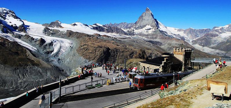 采尔马特周围的山上,有很多观景平台,可搭乘登山齿轨列车上去,轻轻松松,逍逍遥遥。列车每到一个观景平台,就会停车,让游客下车观景。随着列车在山间迂回盘旋,马特峰的山形也发生着微妙的变化。随车一直去到终点站Gornergrat才下车,这里海拔3089米,是观看马特宏峰的最佳场所。