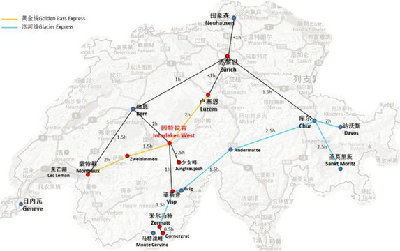 ① 黄金线路线:苏黎世—琉森—Brünig Pass—因特拉肯——蒙特勒—日内瓦