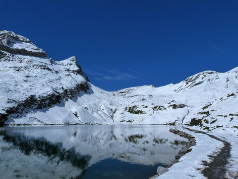 2、东线:First - Balchalpsee – First,是个双向的徒步线路,单程徒步约1小时,First大气开阔,Balchalpsee如果天气好,无风,小湖会倒映出雪山,按JTB上的说法,下午游览这一段会比较好。