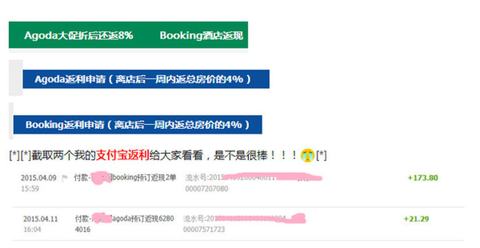 有些网站与他们有合作关系,从合作网站点进去并且成功订房的,这个合作网站就会给你返利,我觉得非常靠谱,真金白银用支付宝转账!!!而且离店后没几天就到账了,简直棒棒哒!!!活动如下图: