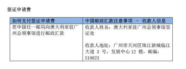 签证申请费(740元)的收款人姓名:澳大利亚驻广州总领事馆签证处