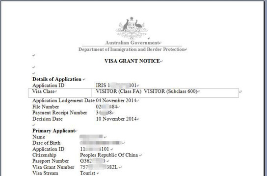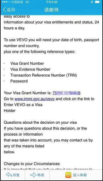 因为遇上圣诞节大使馆放假,所以这次等待时间比较久,大概十一二天的时候,上次因漏接大使馆电话的小嫂子接到了电调,并顺利出签,另一个小嫂子一直没有接到电调电话(她们递交材料时是分两个邮包递交的),也没有收到大使馆审理结果的邮件,所以我写了一封催签信(英文)到visaenquiries.guangzhou@dfat.gov.au 也就是上面说的用VEVO查询签证详情,邮件寄出后我才用VLN查了签证状态,显示在前一天结果就已经出来了,可是我们没有收到签证结果的邮件,所以大使馆还是回复了我们,并给了我们VISA GRANT NUMBER,顺利查询到签证结果。