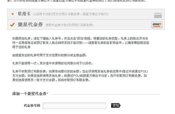 使用捷星代金券付款可免除每人8.5AUD信用卡手续费步骤如下:在这个网址购买捷星代金券(中文网不提供捷星代金券,所以我们上英文网买)