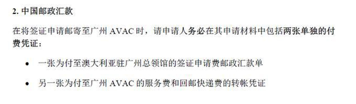 注意:邮寄到广州澳大利亚签证中心,将两张单独的邮政汇票一并邮寄。邮政汇票交复印件也可以,可以在复印件的空白地方写上护照号码、签证申请类型以及联系方式。