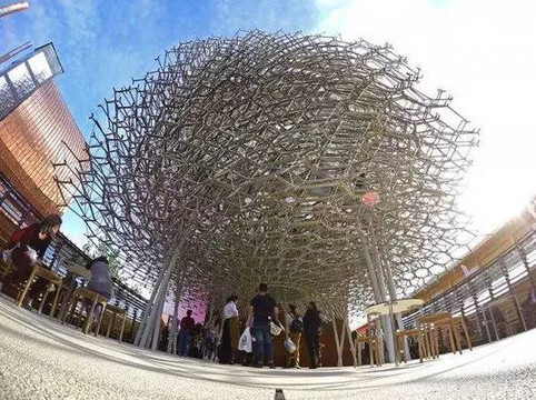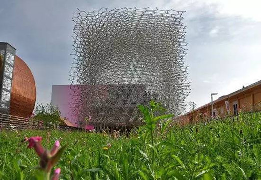 英国馆由英国艺术家Wolfgang Buttress设计,与工程师Tristan Simmonds、BDP建筑工作室合作完成。巨大的结构是由169300个独立的铝配件组合而成,按照斐波那契序列组装在一起,形成一个巨大的蜂巢结构。灵感来源于蜜蜂专家Martin Bencsik博士的科学研究,这座独特的展馆可以实现音频声音和视觉效果都和英国的真实的蜂巢相联系在一起。
