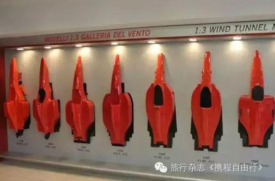 博物馆的门口摆放的是 1:3 的方程式赛车车壳模型。这些模型是法拉利 F1 车队用来在风洞里测试风阻系数的。碍于 F1 的规定,车队不可使用 1:1 的实体车壳进入风洞测试,所以才有了这些 1:3 比例的模型。