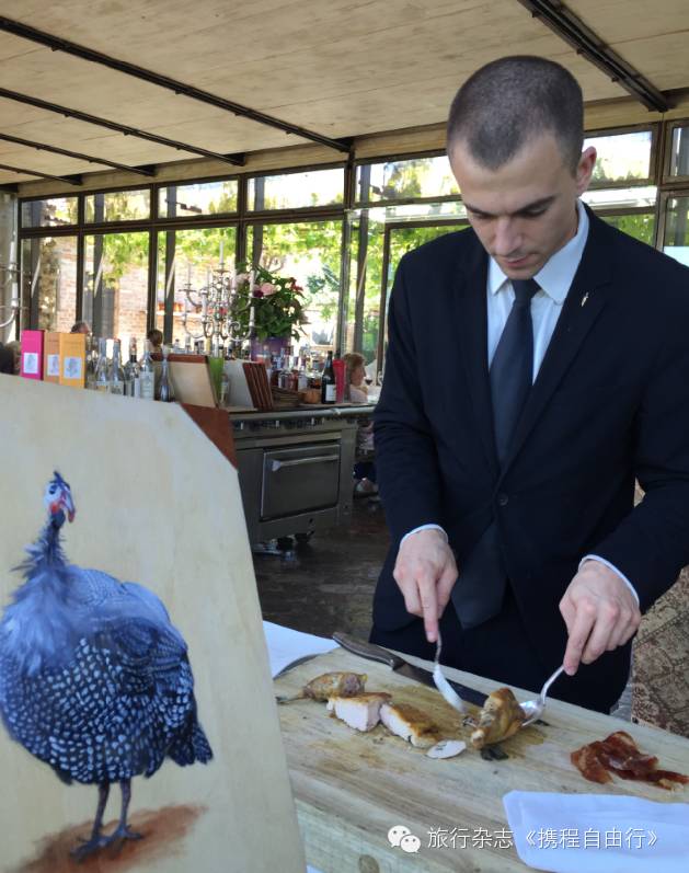 颜值颇高的waiter当场帮我们将主食——珍珠鸡装盘~