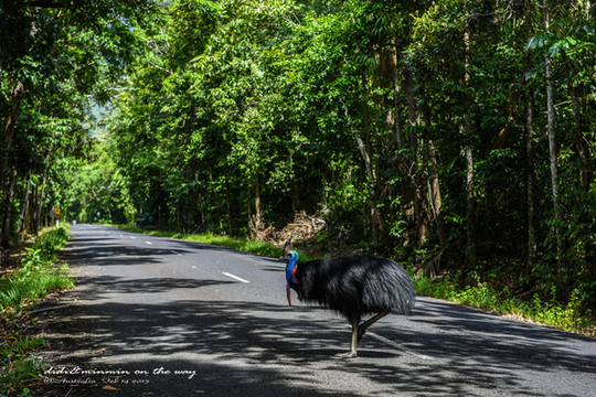 最幸运的事发生在回程的路上,远处的一直类似鸵鸟的庞然大物吸引住我们的眼球,那是传说中的cassowary,澳大利亚国宝级的大鸟,丹翠雨林的形象代言,据说现存的仅有几百只,在马路上碰见真的很幸运。