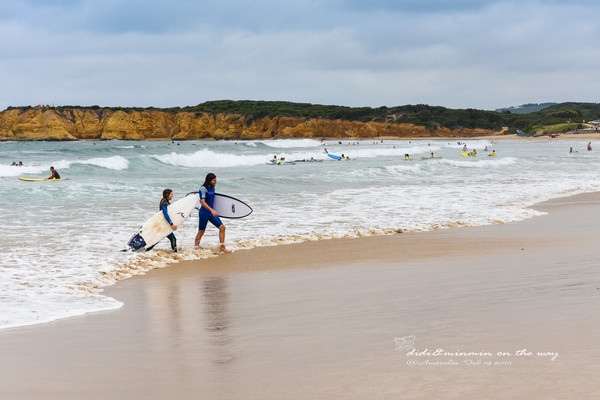 放下行李我们又开车到镇上转了转,在Apollo Bay,我们遇到了一位当地老奶奶,看到我们很热情的向我们说“happy Chinese new year”,聊天过程中我们被她手中的冲浪板吸引,老公玩性大发,借走了冲浪板,准备进行冲浪初体验。期间,跟老奶奶谈天说地一顿神侃,口语水平突飞猛进!