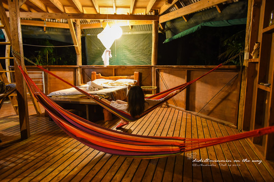 从刚才那个门走过来要5分钟。后面小溪,和森林,自己随便玩,有胆量的话,最近我们和他们联系,屋子周围来过大蛇和大蜥蜴。好在我们那天转的时候没看见。我们的树屋是一栋没有窗户,四面开放的小木屋,随时都会有雨林的各种小动物到访;没有任何家用电器,但是厨房、厕所、浴室都是有的,只不过都是你能想象到的最原始的样子,甚至比你想象的更原始。厕所呢,是生态厕所,便便顺着大管子直接砸到地上;浴室更加刺激,全开放,面对雨林,脱光了直接洗,没有屋、更没有门。开始还觉得挺别扭的,真正享受其中就会觉得挺舒服、很习惯。其实这里就是一个原始森林,比莫斯曼峡谷还原始。小屋后面的小道,主人用自己的思维装饰了下,其实有点不搭,不过有他的特色。